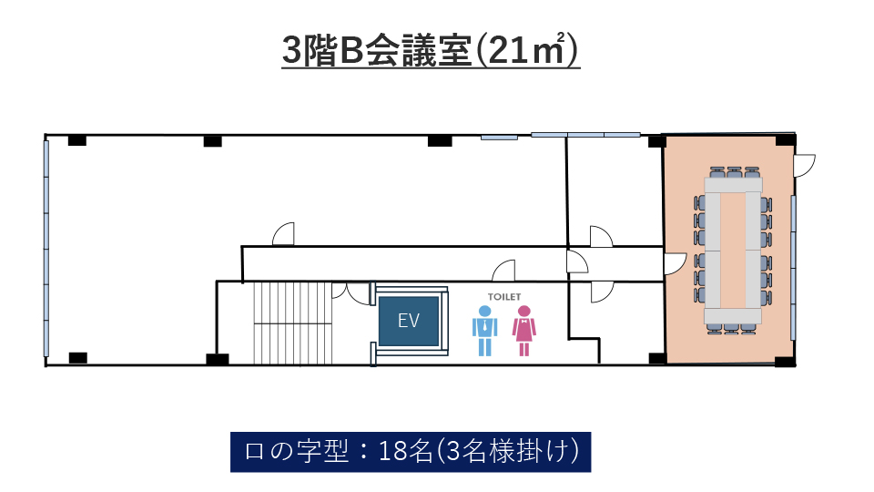 | 3階B会議室 | 21㎡ | 18名 | 18名 | 15名 | 9名 (1島) |