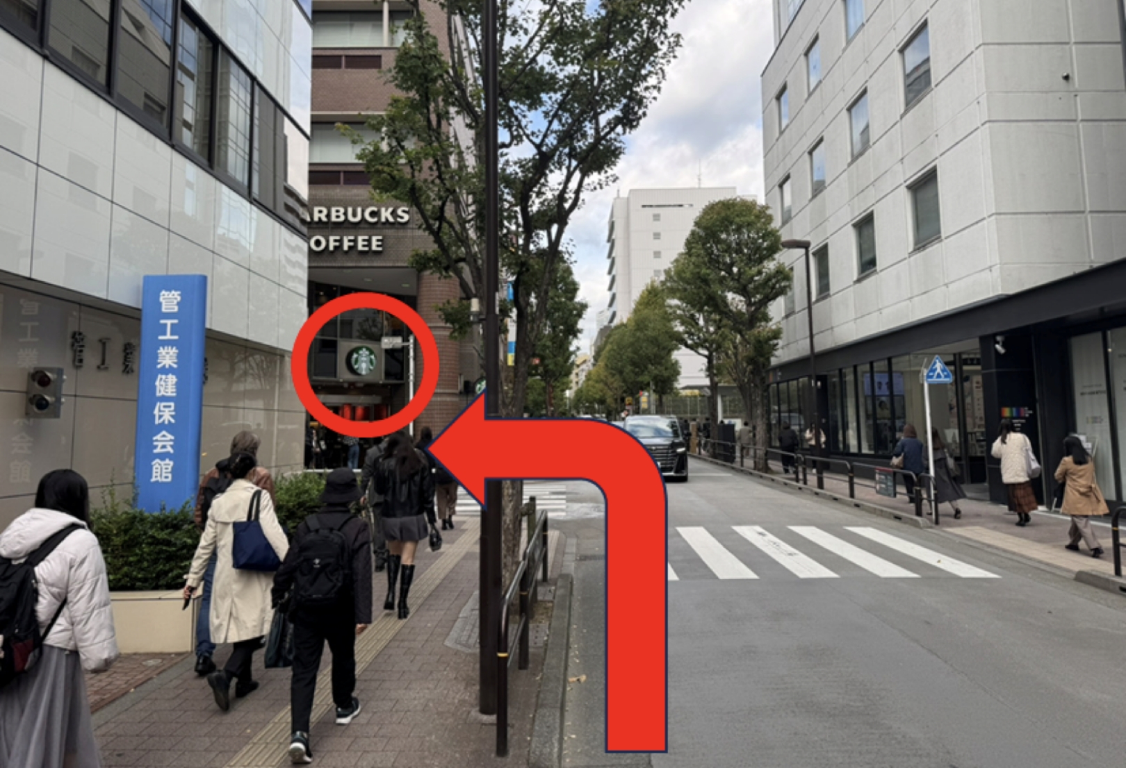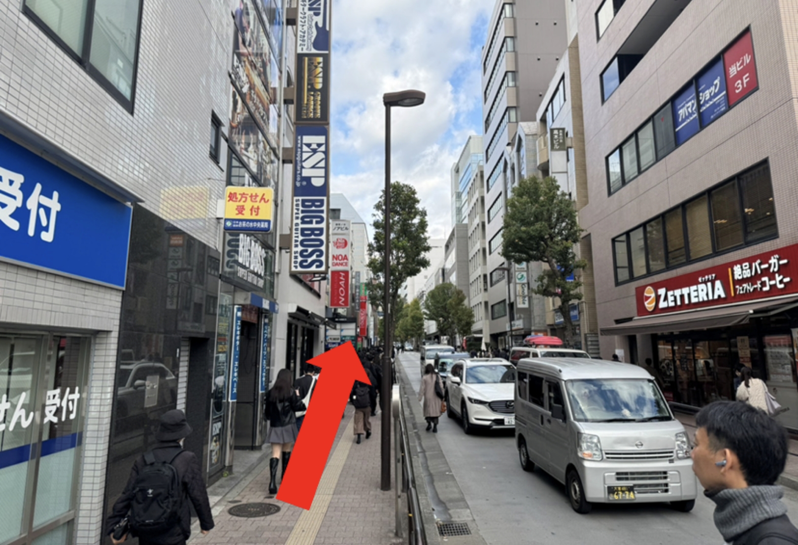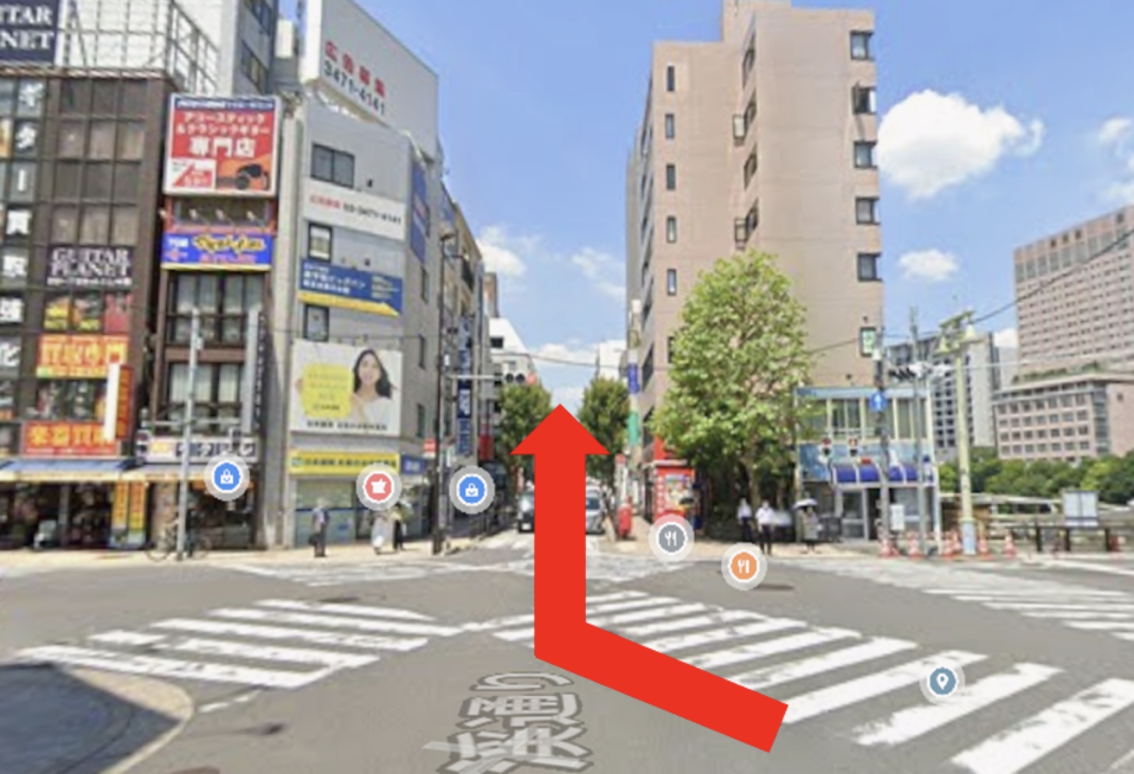 ①御茶ノ水橋口を出て交差点を斜めに渡りかえで通りを進む