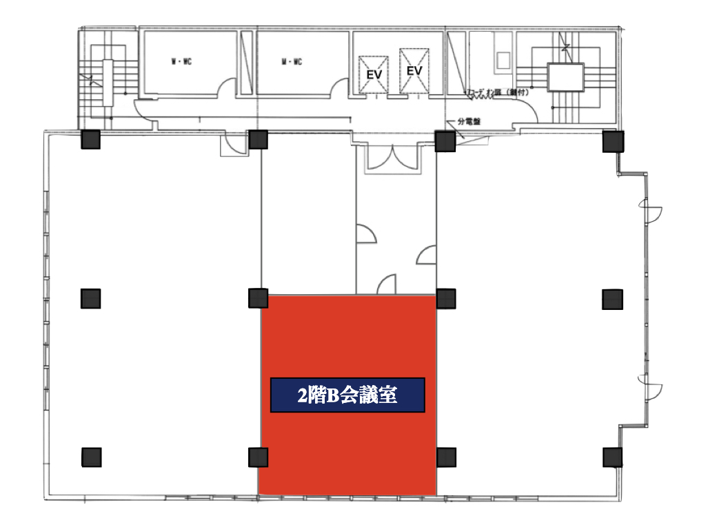 | 2階B会議室 | 53㎡ | 30名 | 30名 | 24名 | 27名(3島) | 24名(4島) | 36名 | - | ¥9,240/1h ¥74,800/9h |