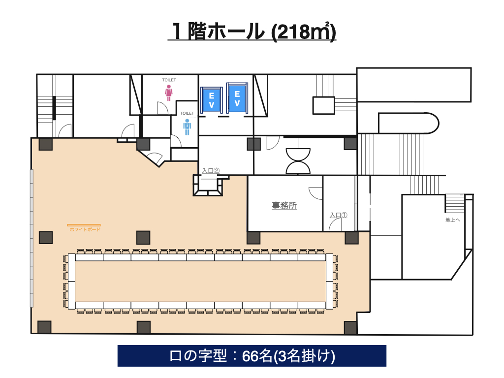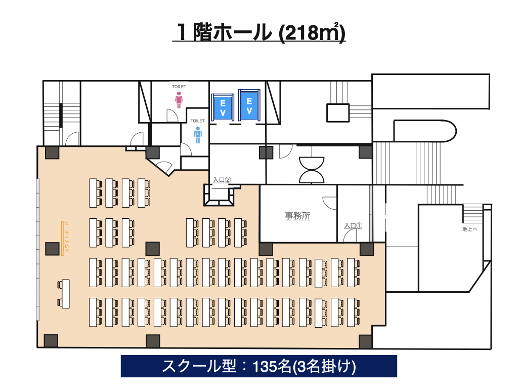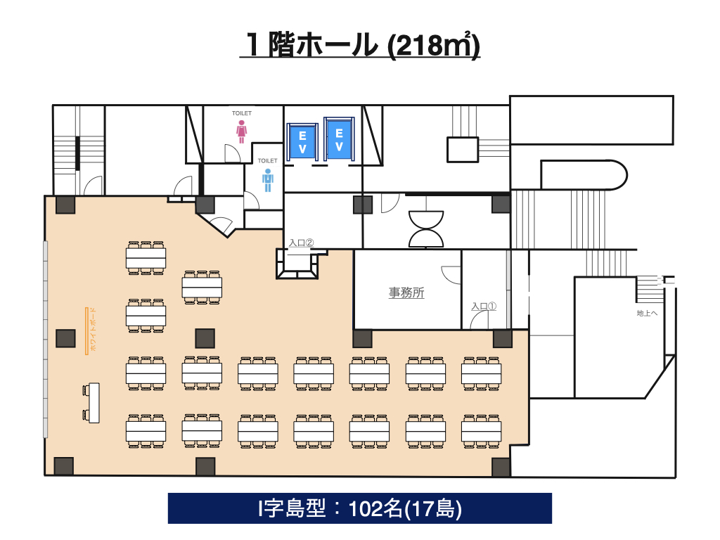 | 1階ホール | 218㎡ | 135名 | 66名 | 60名 | 117名 (13島) |