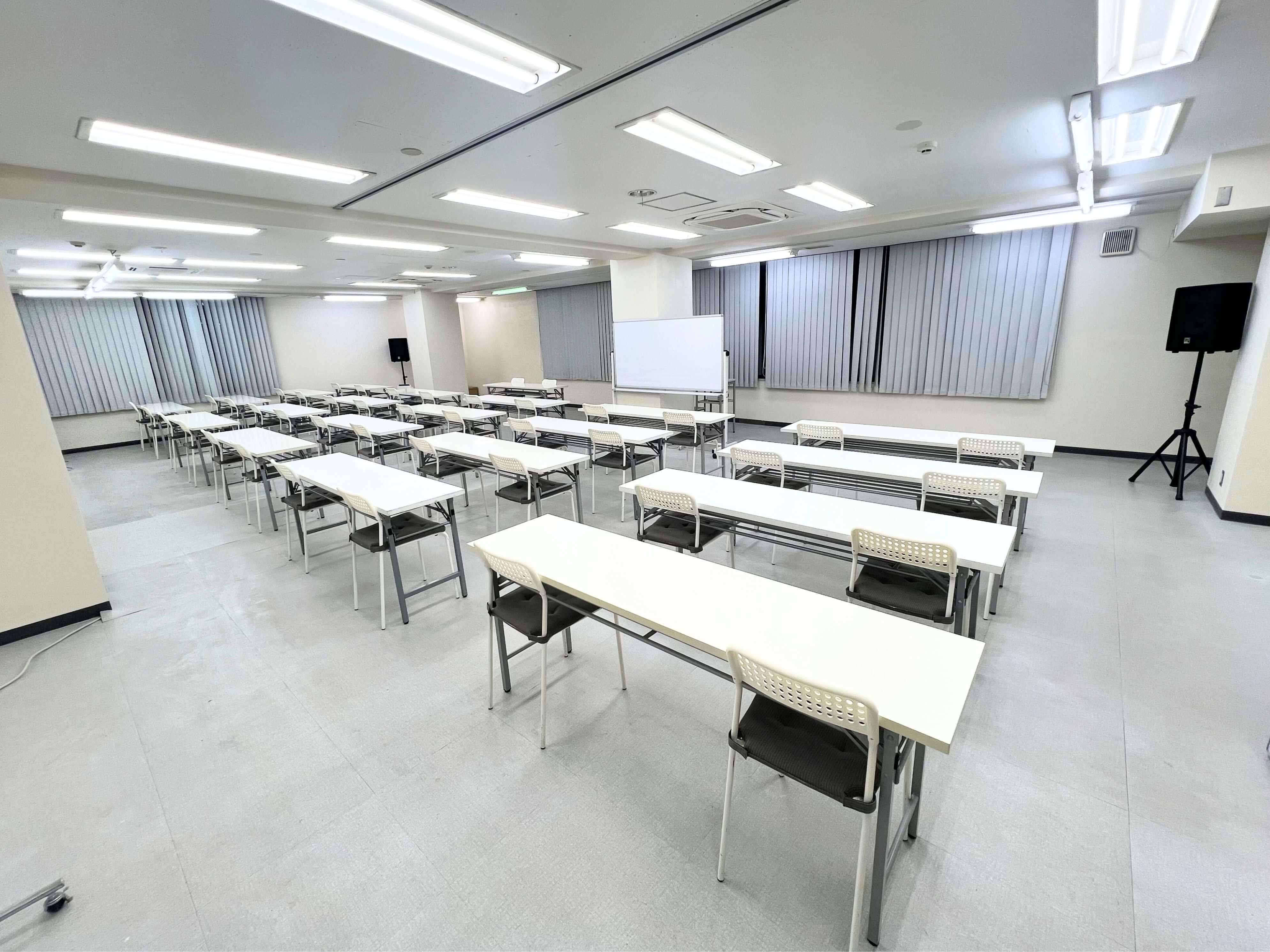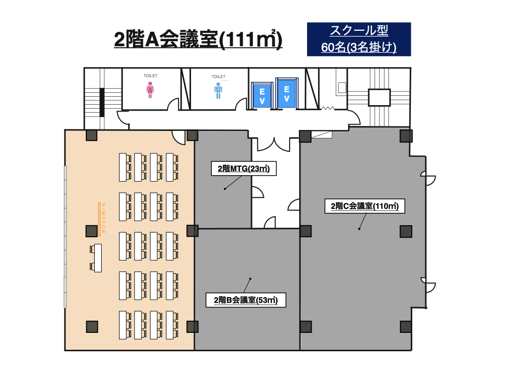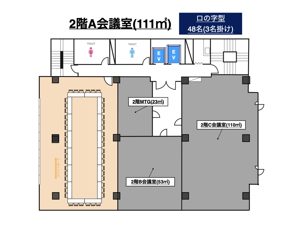 | 2階A会議室 | 111㎡ | 60名 | 48名 | 42名 | 54名(6島) | 48名(8島) | 72名 | - | ¥16,500/1h ¥133,650/9h |