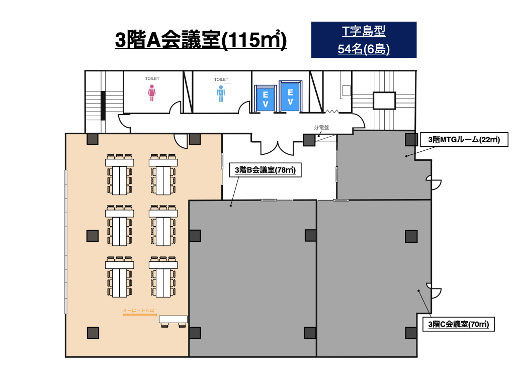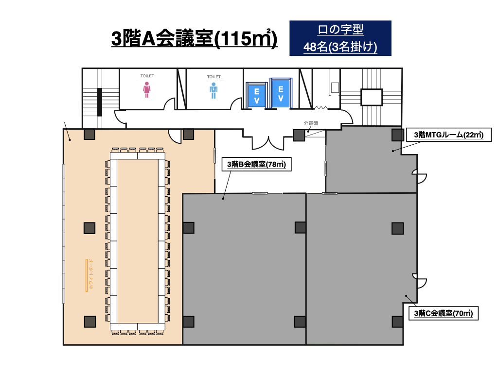 | 3階A会議室 | 115㎡ | 60名 | 48名 | 42名 | 54名(6島) | 48名(8島) | 72名 | - | ¥16,500/1h ¥133,650/9h |
