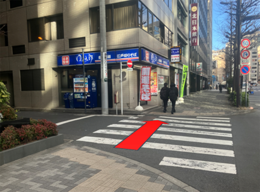 ①北口(靖国通り方面口)を出て斜め右に直進。