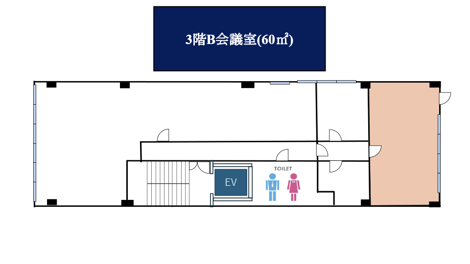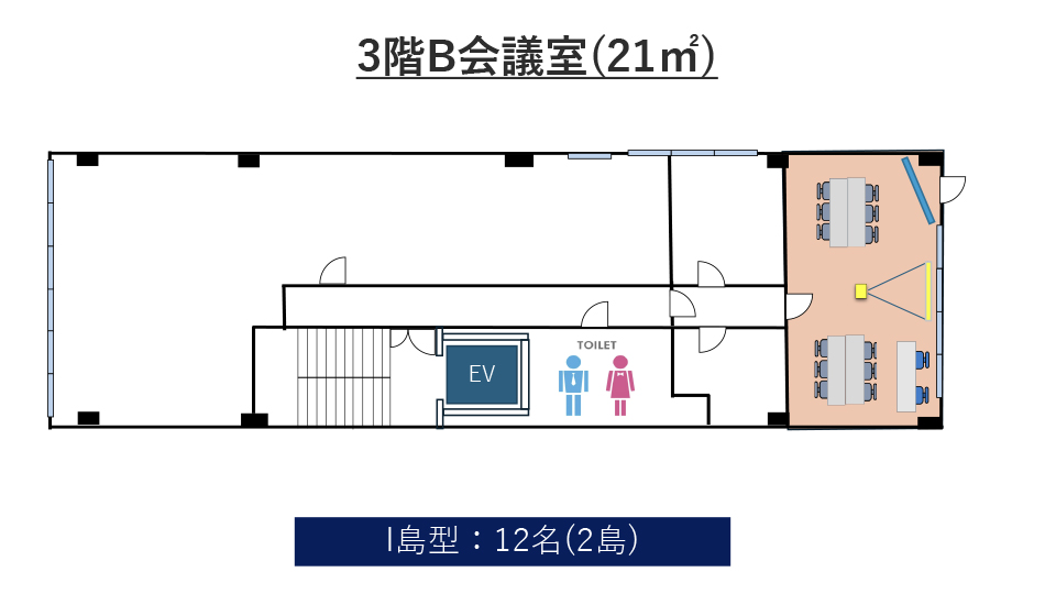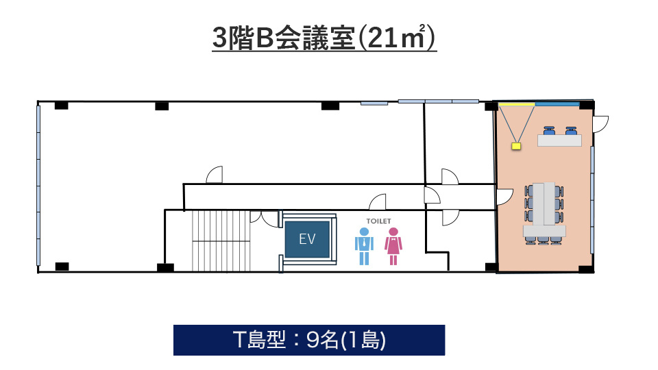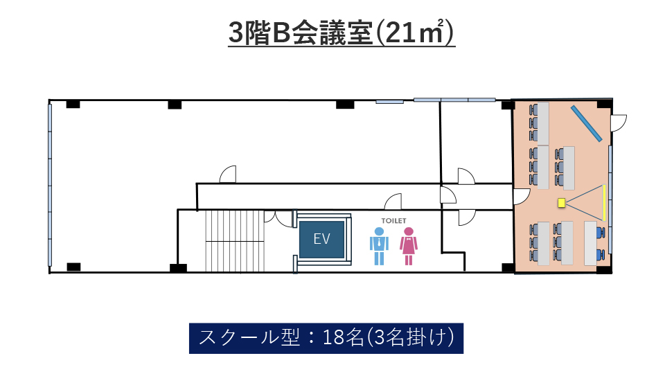 | 3階B会議室 | 21㎡ | 18名 | 18名 | 15名 | 9名 (1島) |