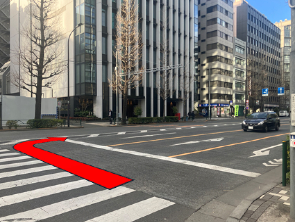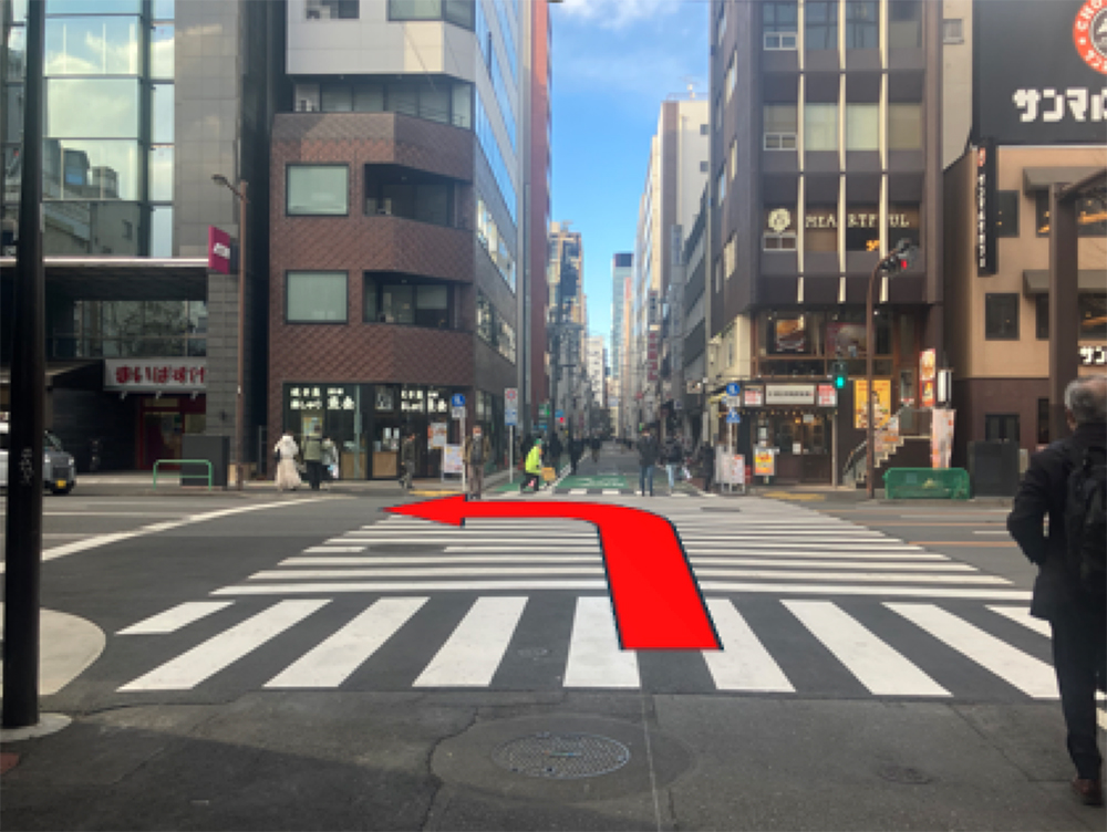 ①北口(靖国通り方面口)を出て斜め右に直進。