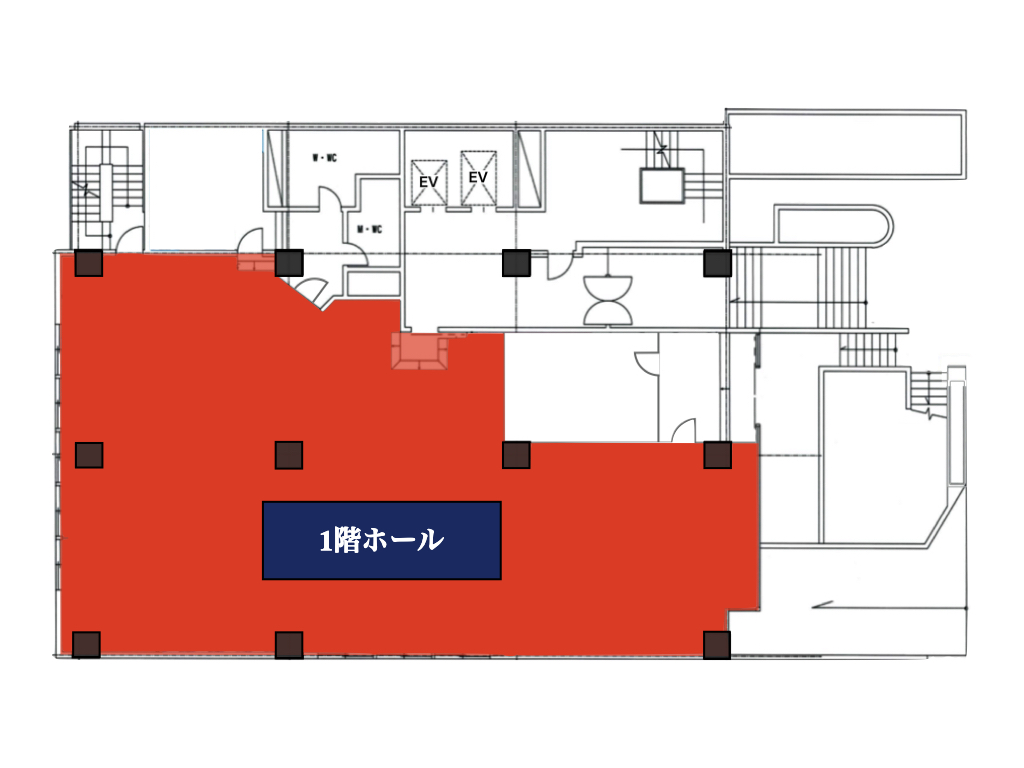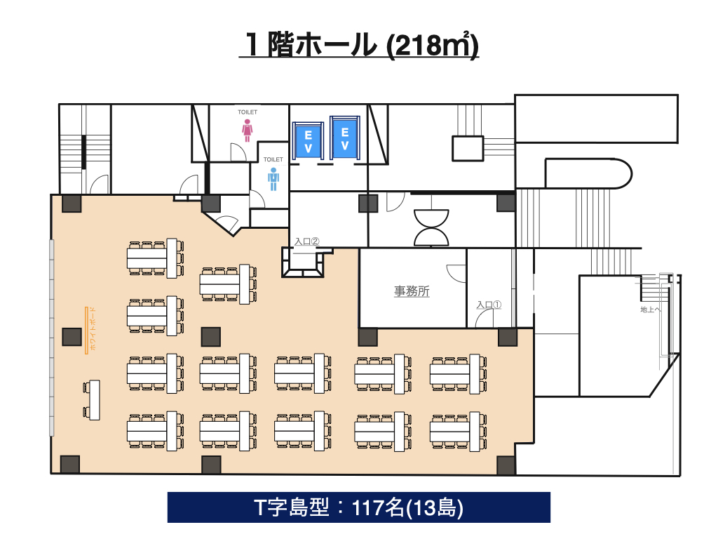 | 1階ホール | 218㎡ | 135名 | 66名 | 60名 | 117名 (13島) |