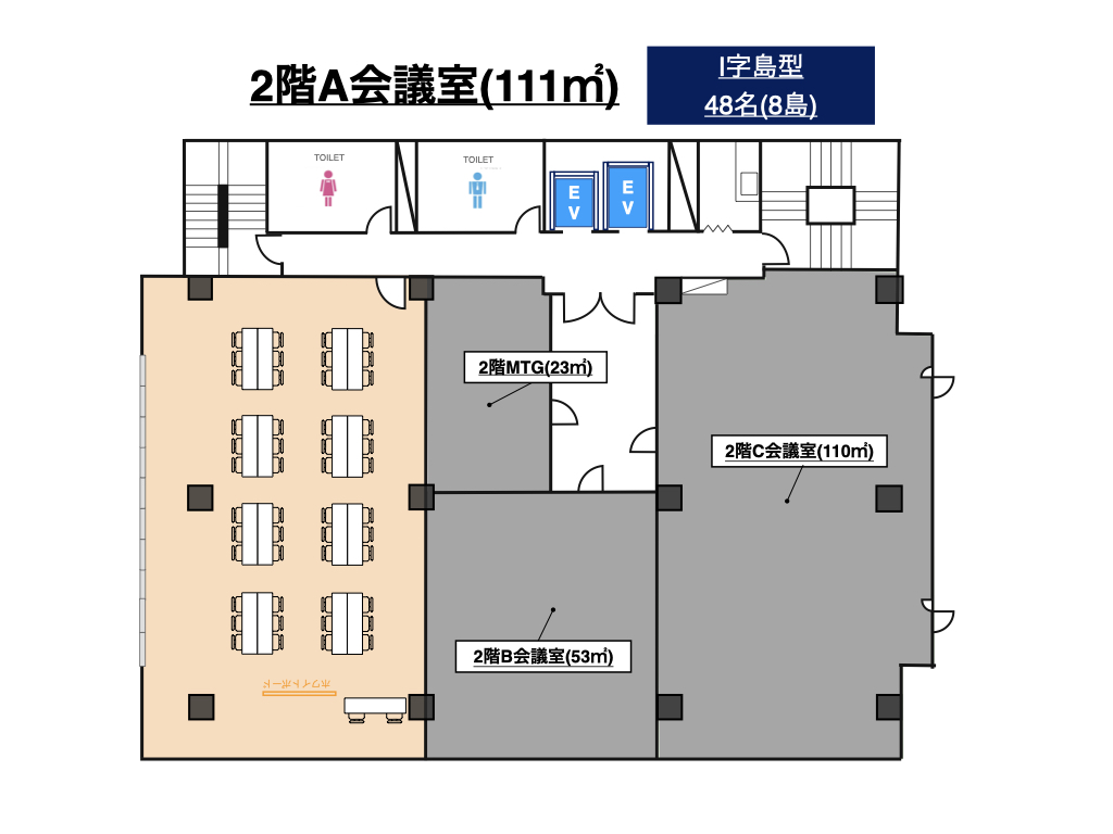 | 2階A会議室 | 111㎡ | 60名 | 48名 | 42名 | 54名(6島) | 48名(8島) | 72名 | - | ¥16,500/1h ¥133,650/9h |