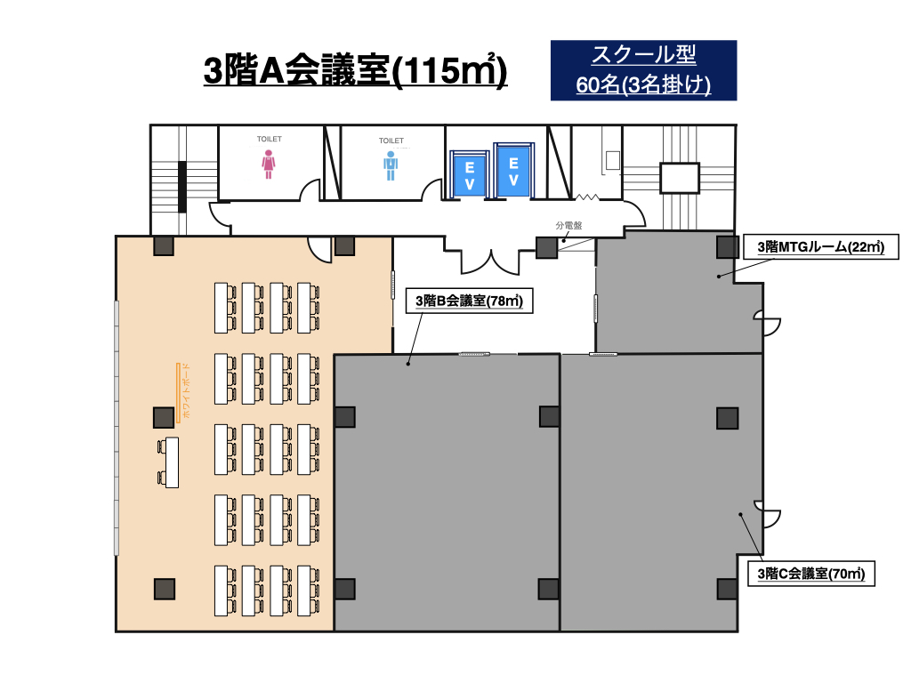 | 3階A会議室 | 115㎡ | 60名 | 48名 | 42名 | 54名(6島) | 48名(8島) | 72名 | - | ¥16,500/1h ¥133,650/9h |